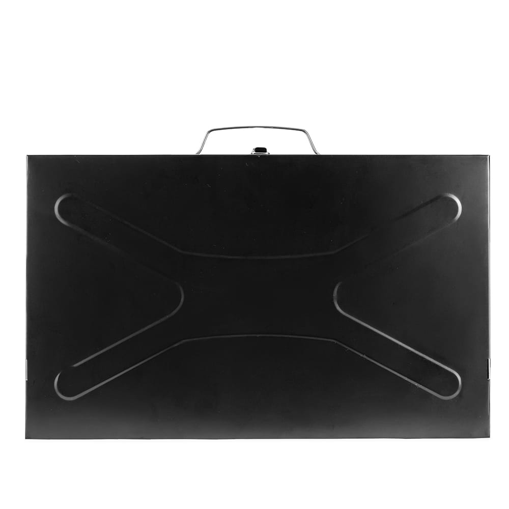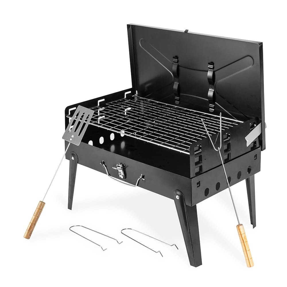 Churrasqueira feita em metal com funcionamento a carvão.Possui formato compacto e pode ser transportada como uma maleta quando desmontada, além de alça para transporte, trava de segurança para fechamento e quatro pés retráteis. Acompanha uma espátula e espeto duplo com cabo em madeira.