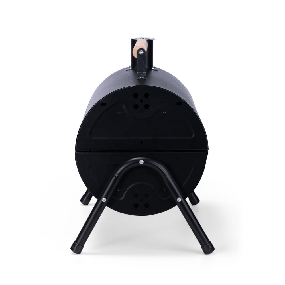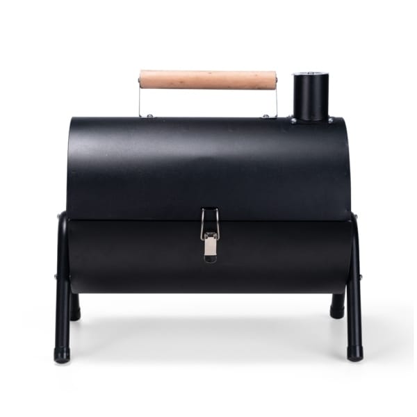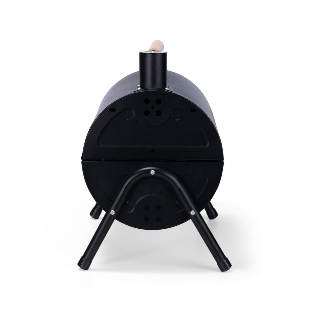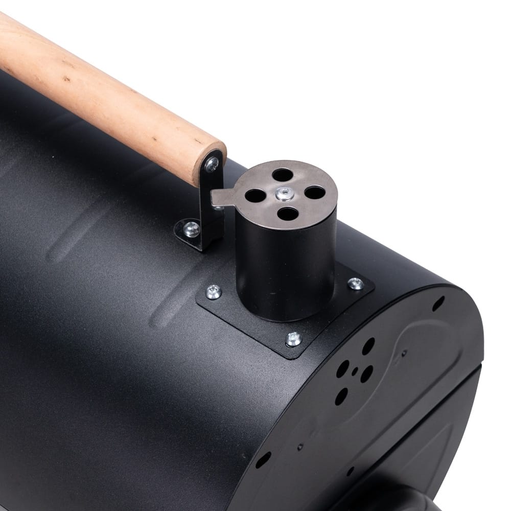 Churrasqueira portátil de formato cilíndrico com estrutura em ferro que permite o uso em duas faces ao mesmo tempo. Possui cabo em madeira de faia, chaminé com regulador, protetor emborrachado para os pés e trava de segurança. Acompanha duas grelhas e duas placas para encaixe interno galvanizado.
