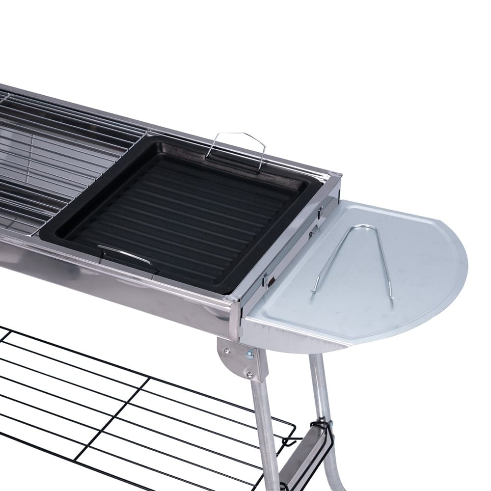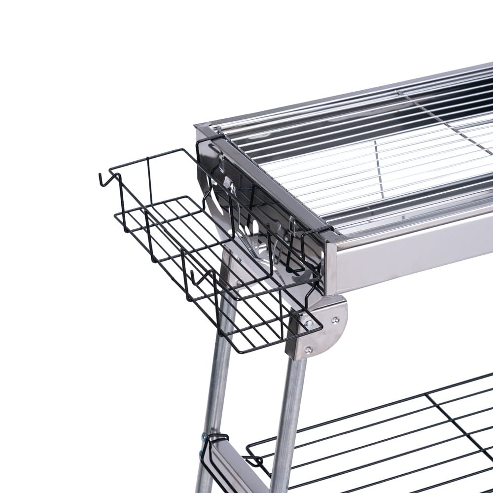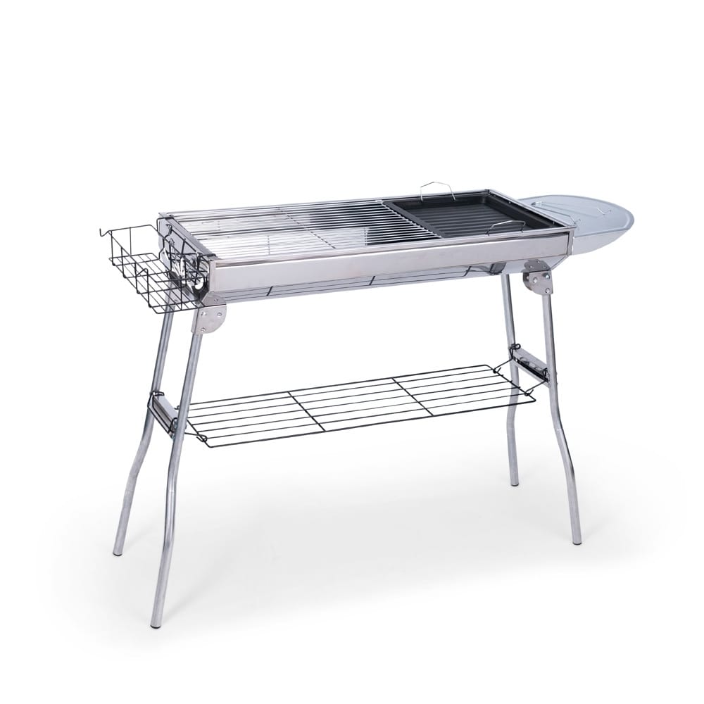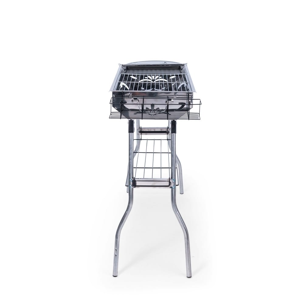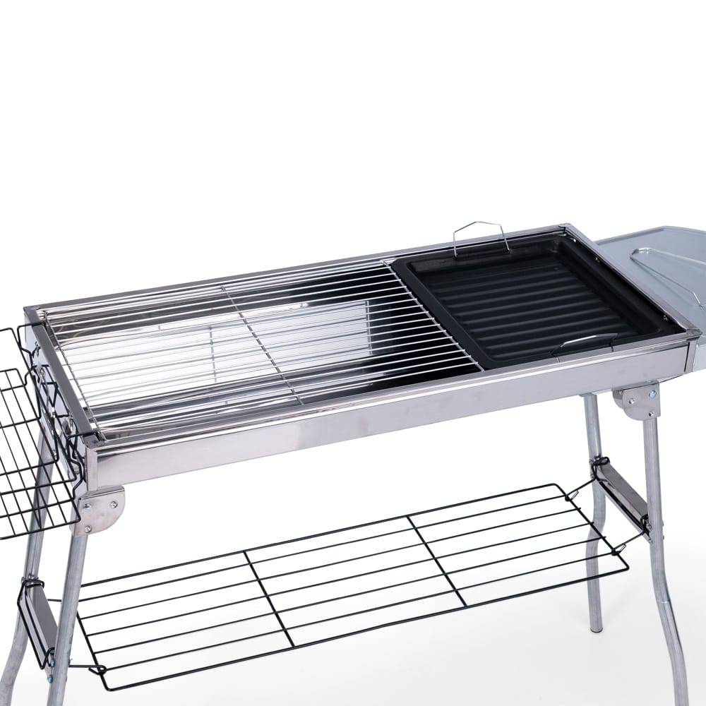 Churrasqueira dobrável em aço inoxidável. Conta com pés dobráveis com encaixes para prateleiras laterais multiuso e prateleira inferior de apoio. Possui duas grelhas para acomodação do carvão e três grelhas para encaixe na parte superior, incluindo uma em ferro com alças metálicas. Acompanha chave Phillips e parafusos para a montagem dos pés.