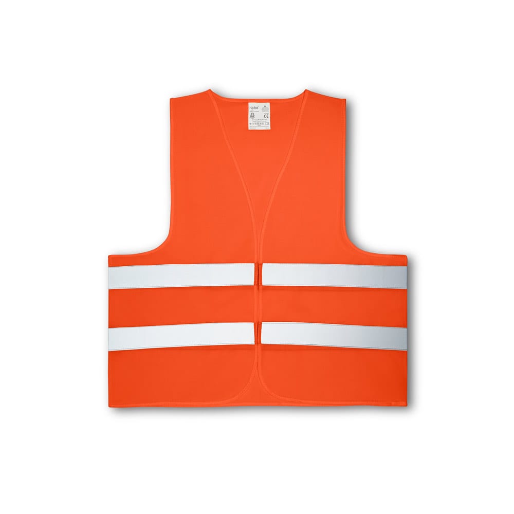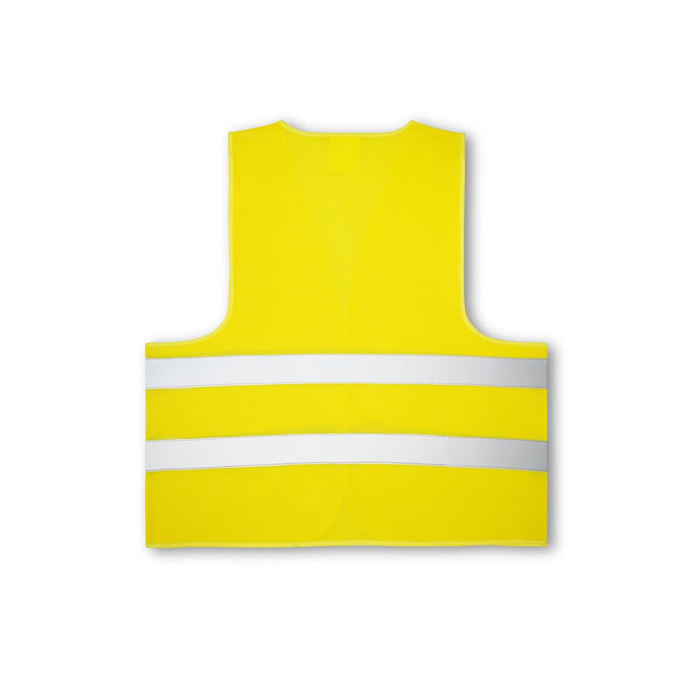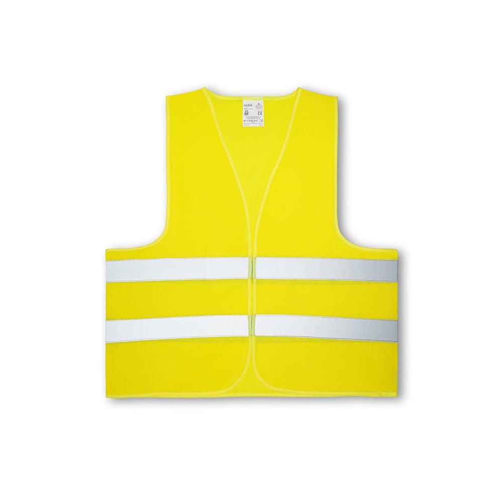Colete de alta visibilidade em poliéster, com certificado pela norma EN ISO 20471 classe 2. Colete refletivo com 2 bandas refletoras horizontais e abertura frontal com fecho aderente