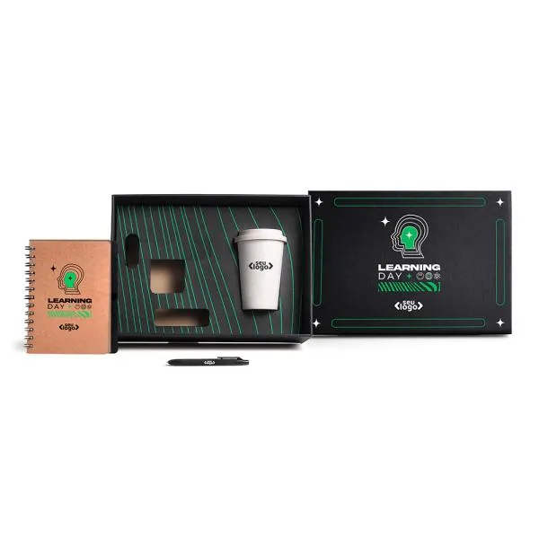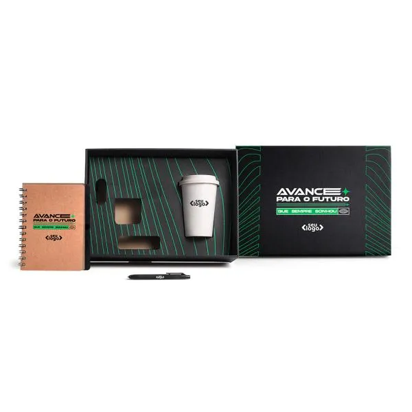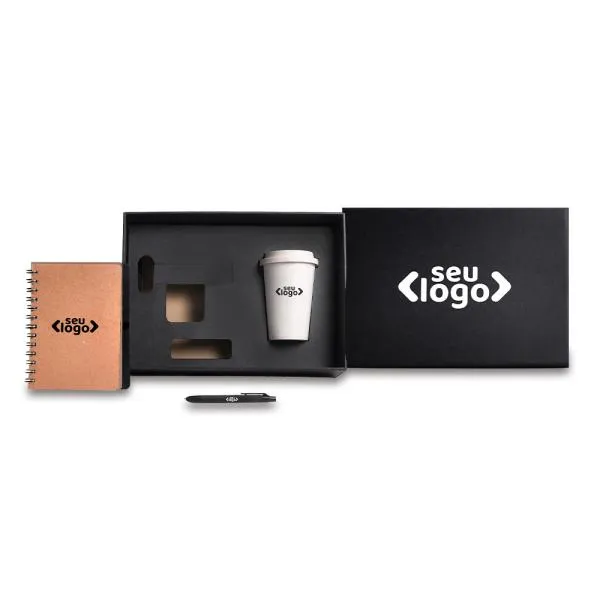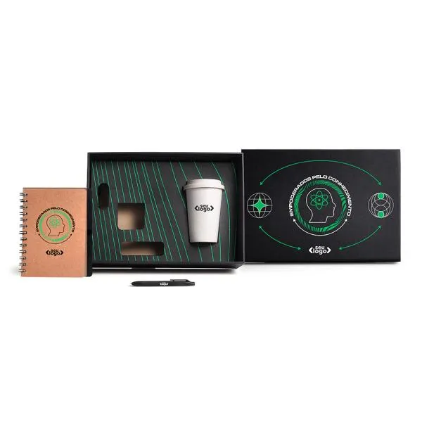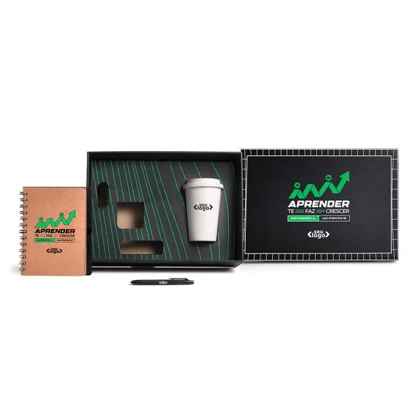 - Gravação: Silkscreen aplicado no copo, no caderno e na tampa da caixa — três pontos de exposição da sua marca