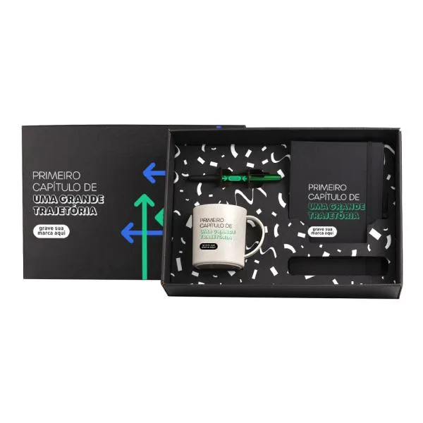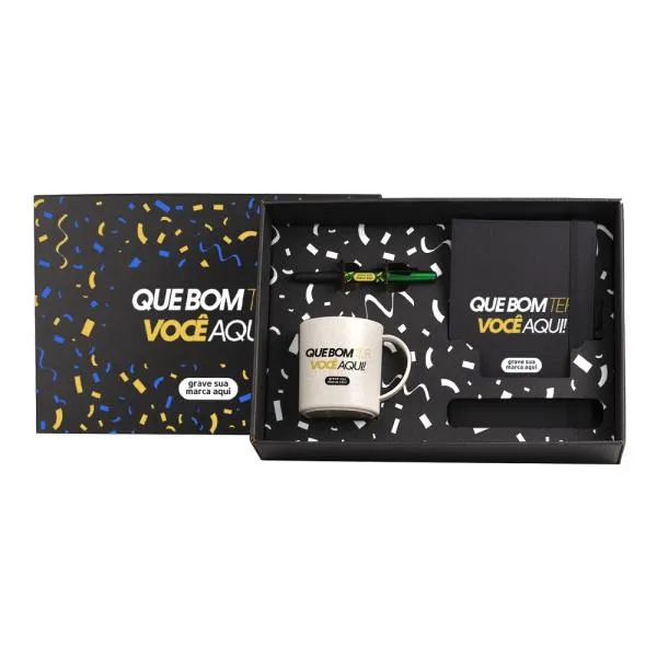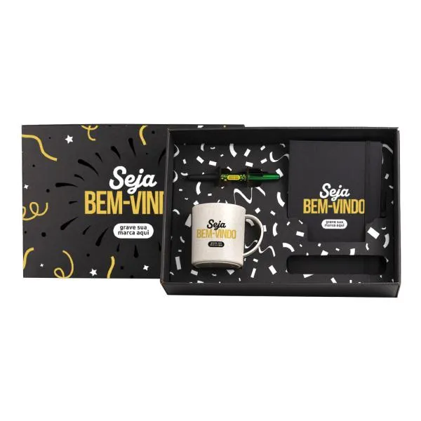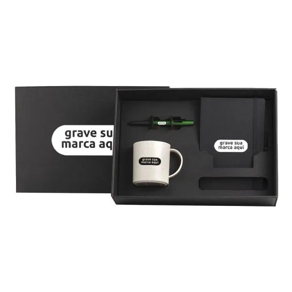 Um kit de boas-vindas bem estruturado comunica, desde o primeiro dia, o cuidado que sua empresa tem com as pessoas. Este conjunto com caneca, caderneta e caneta entrega ao novo colaborador ou parceiro tudo o que ele precisa para começar com organização — e ainda carrega a identidade visual da sua marca em cada item. Com gravação em silkscreen nos três itens e apresentação em caixa preta, o conjunto transmite atenção aos detalhes sem precisar de exageros. Na White Brindes, você vê o produto pessoalmente no nosso showroom ou aprova o layout virtual antes de qualquer produção.