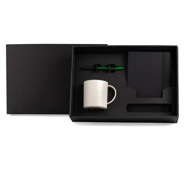 Kit com caneca, caderneta e caneta.