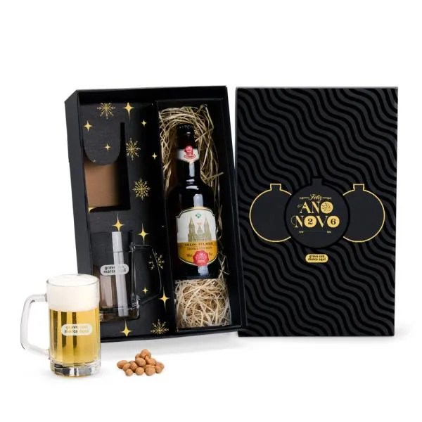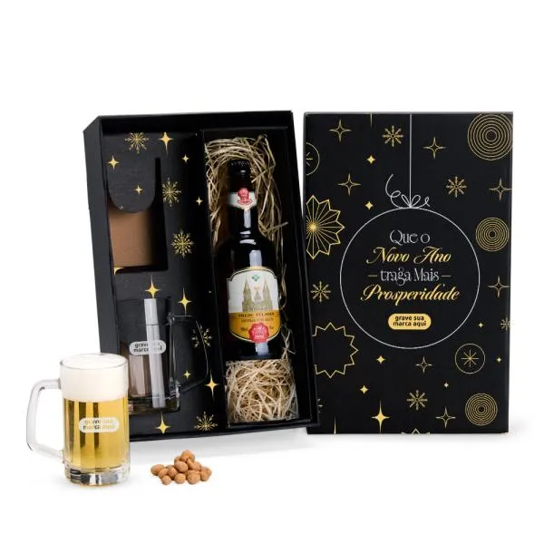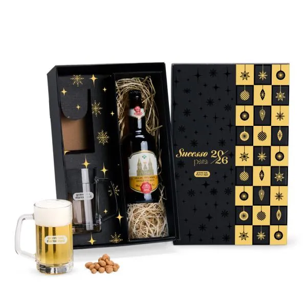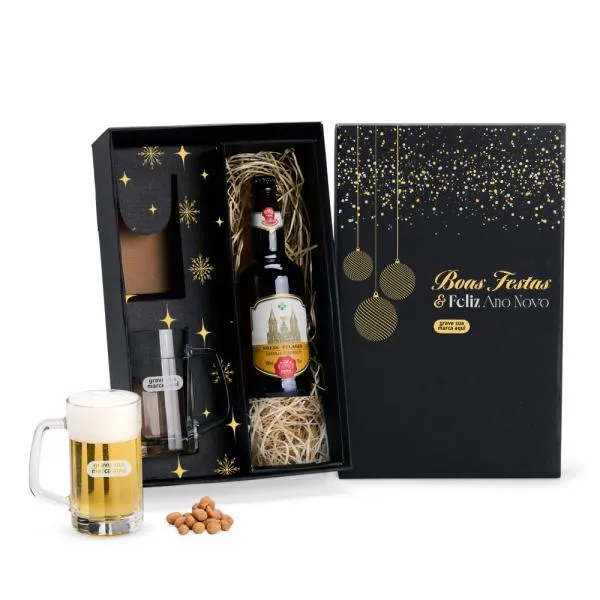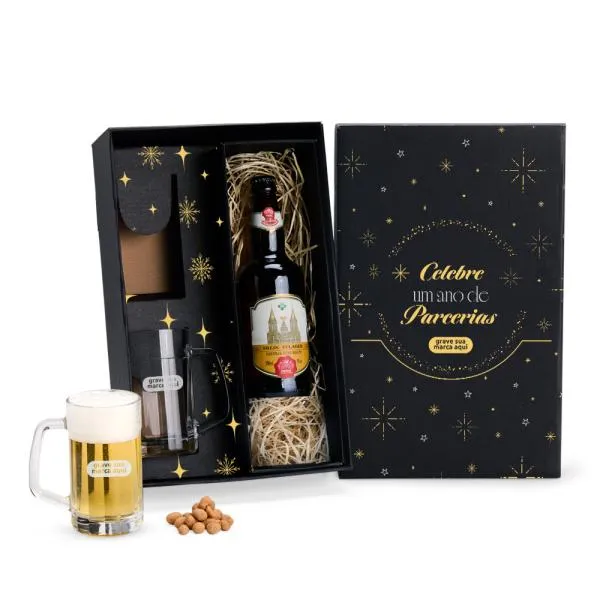 Um conjunto de brindes corporativos que chega pronto para presentear: duas canecas americanas para cerveja ou chopp, acomodadas em caixa preta com espaço dedicado para garrafa, com personalização tanto nas canecas quanto na tampa da embalagem. Indicado para empresas que buscam um brinde de fim de ano com apresentação cuidada e utilidade no dia a dia. Com a White Brindes, você visualiza o resultado antes da produção e conta com atendimento consultivo em cada etapa.