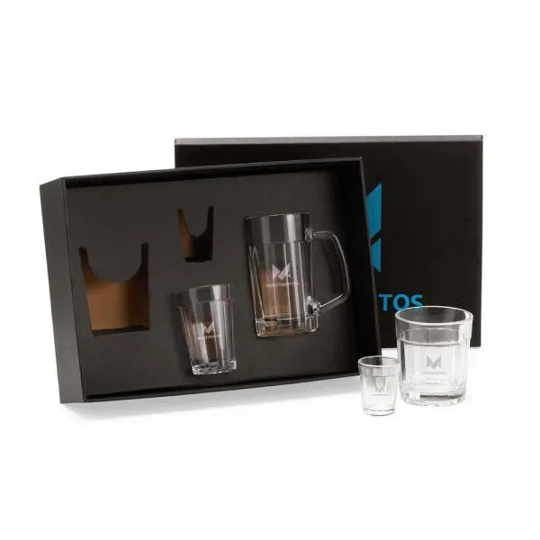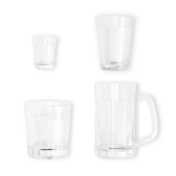- Composição do conjunto: 4 peças em vidro — copo americano multiuso, copinho para dose, copo para drinks e caneca americana para cerveja/chopp