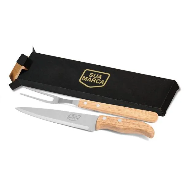 - Composição: Faca 7″ e garfo em madeira com aço inox