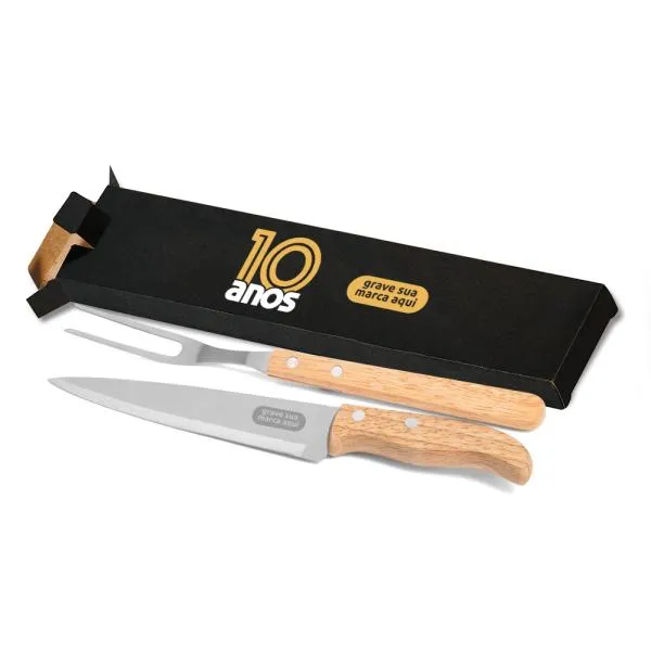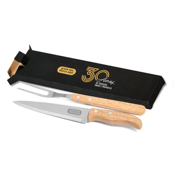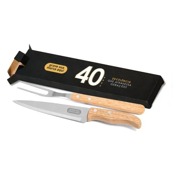 Um conjunto de faca e garfo em madeira e aço inox que transforma o reconhecimento em algo concreto e memorável. Indicado para empresas que querem marcar datas importantes com um brinde funcional, com acabamento diferenciado e apresentação cuidada. Com gravação a laser na lâmina e personalização na caixa, sua marca fica registrada em um item que as pessoas realmente usam e guardam.