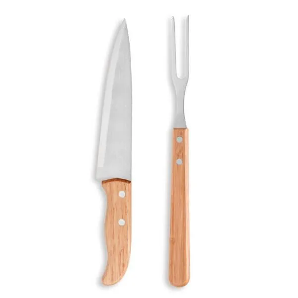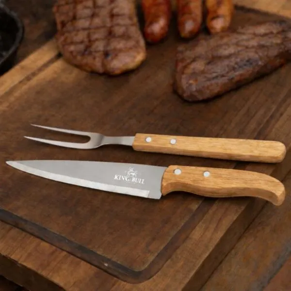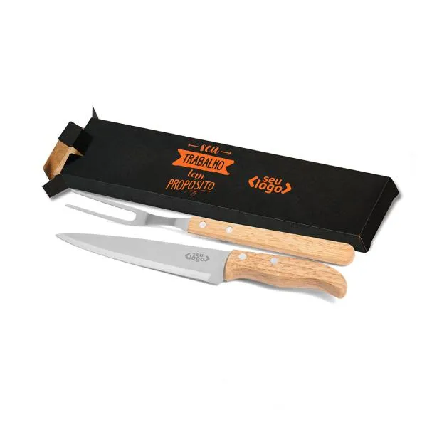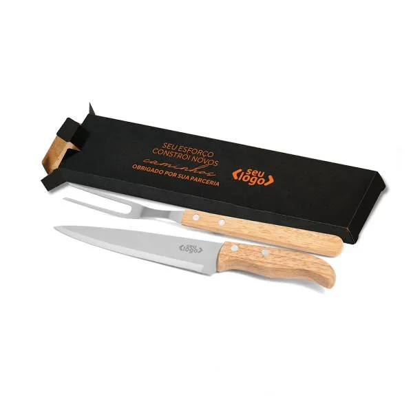 - Composição: Faca 7″ e garfo com cabos em madeira e lâminas em aço inox