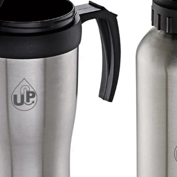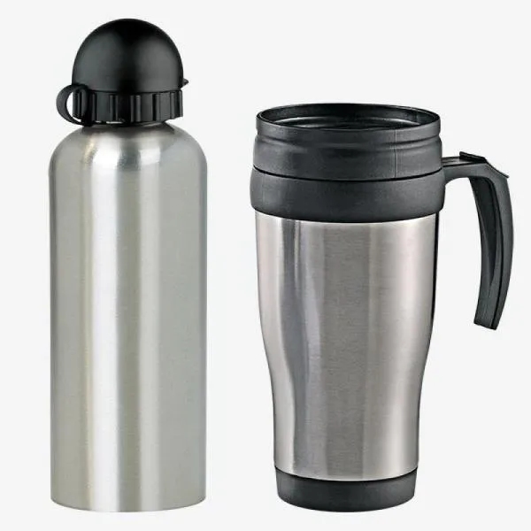 Kit composto por um squeeze em aço inox/polipropileno de 600ml e uma caneca em polipropileno/aço inox de 410ml, perfeitamente acomodados em uma caixa kraft com tampa.