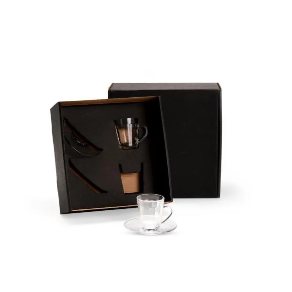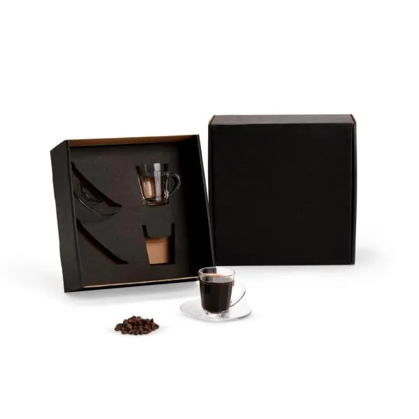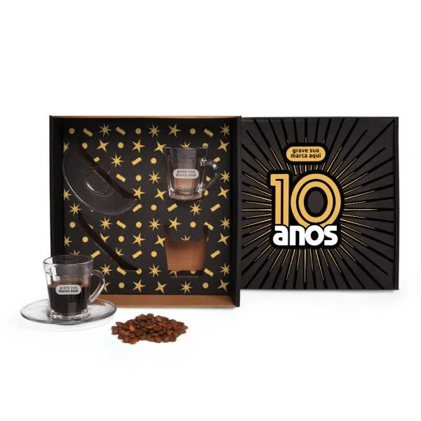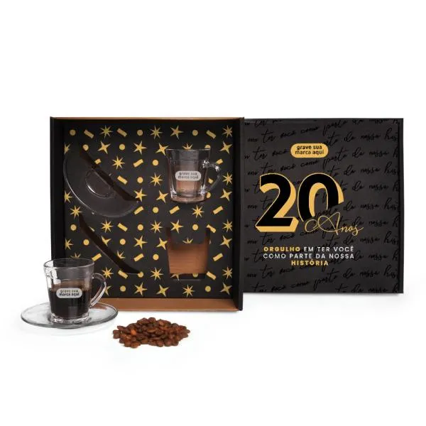 Kit de duas xícaras de vidro com pires, apresentado em caixa preta com gravação personalizada, é uma opção com identidade para marcar datas importantes da empresa. Indicado para celebrações de aniversário corporativo, reconhecimento de colaboradores e presentear parceiros e clientes com algo que comunica atenção à escolha. Com gravação a laser nas xícaras e personalização em silk ou digital na tampa da caixa, sua marca aparece de forma integrada ao presente — do detalhe à embalagem.