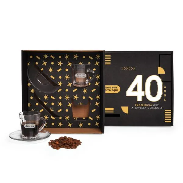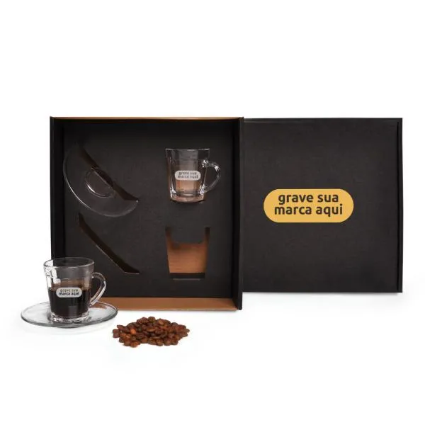 - Personalização em dois pontos de contato: A gravação a laser nas xícaras e a impressão na tampa da caixa criam uma apresentação coesa, onde sua marca aparece tanto na embalagem quanto no objeto em si