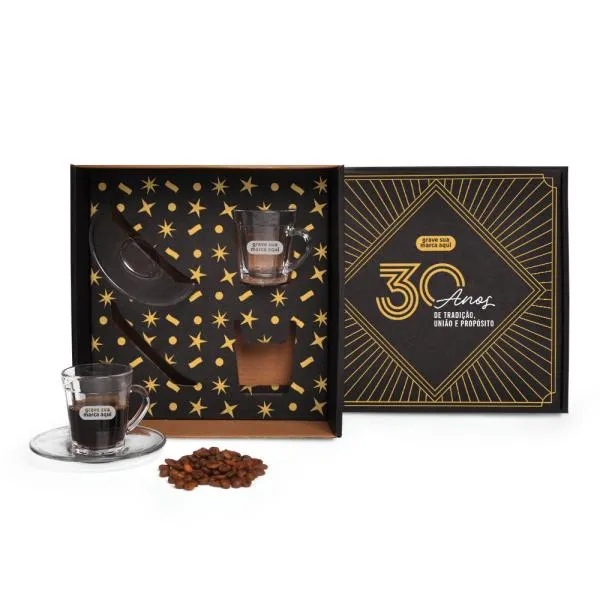 Gravação: Uma gravação a Laser nas duas xícaras e uma em Silk/Digital na tampa da caixa.