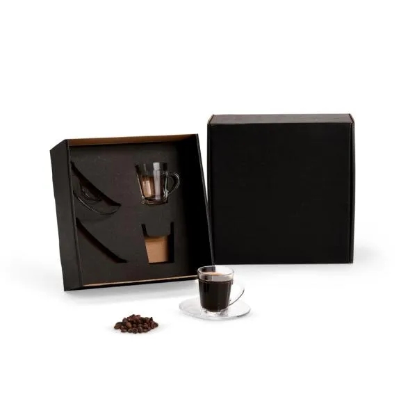 - Personalização em múltiplos pontos: Gravação a laser nas duas xícaras e impressão na tampa da caixa ampliam a presença da sua marca sem exageros
