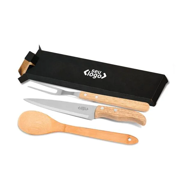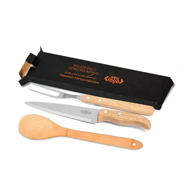 - Materiais: Cabo em madeira, lâmina e garfo em aço inox, colher em bambu