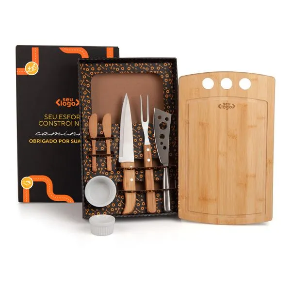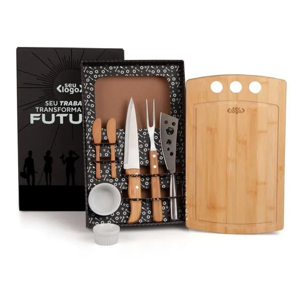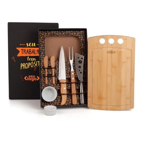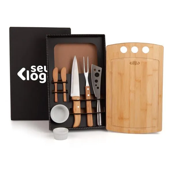 - Composição do kit: Tábua com três furos e duas espátulas em bambu, faca 7” em bambu/inox, garfo trinchante em madeira/inox, faca em aço inox e dois ramekins
