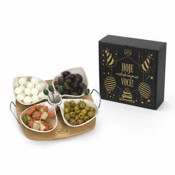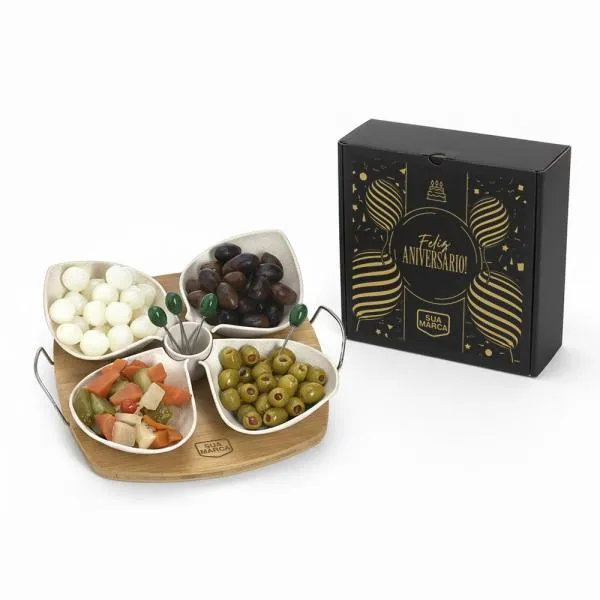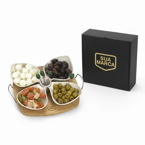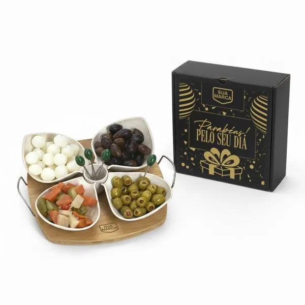Kit para petiscos em bambu e fibra de bambu que transforma momentos de reconhecimento em experiências memoráveis para colaboradores e parceiros. Indicado para empresas que buscam brindes funcionais e com apelo sustentável, ideal para datas comemorativas internas, como aniversários de colaboradores. Com gravação a laser na base e apresentação em caixa preta, o conjunto chega pronto para presentear, sem precisar de embalagem adicional.