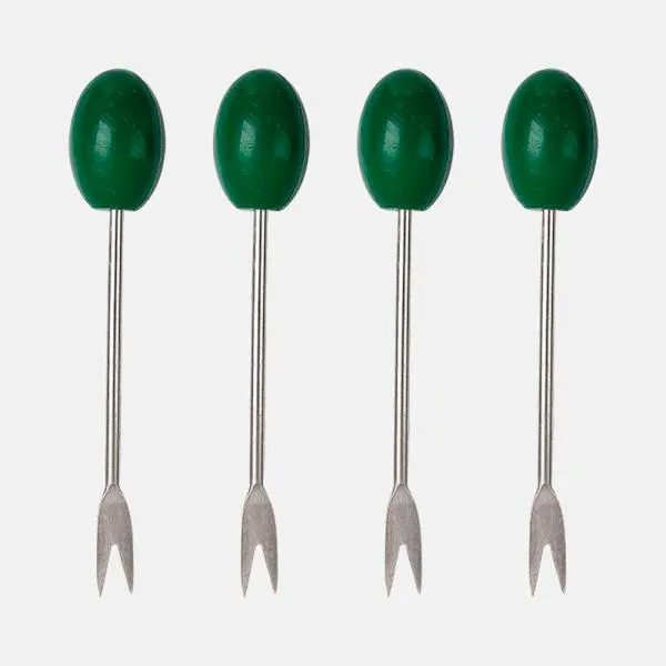 - Composição do kit: 10 peças no total — cinco potes em fibra de bambu e quatro garfos em aço inox com ponta em formato de azeitona
