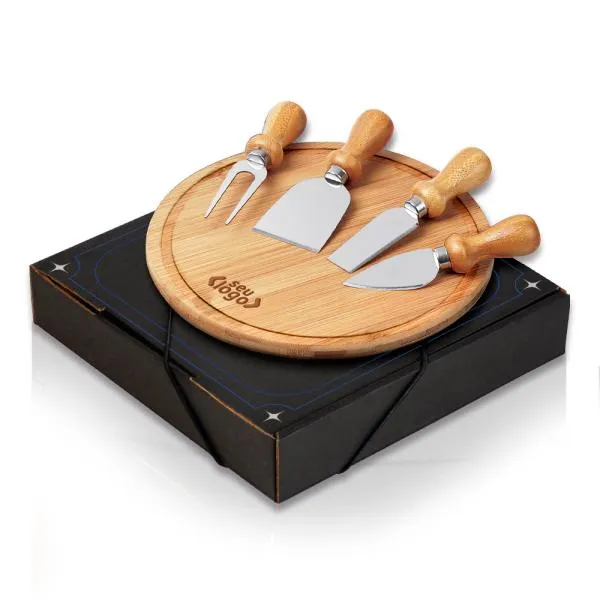 Kit para queijo. Conta com tábua redonda em bambu; duas facas, uma espátula e um garfo em inox/madeira para queijos. Tábua confeccionada com tripla camada invertida, para dar maior durabilidade e não deformar com o passar do tempo.