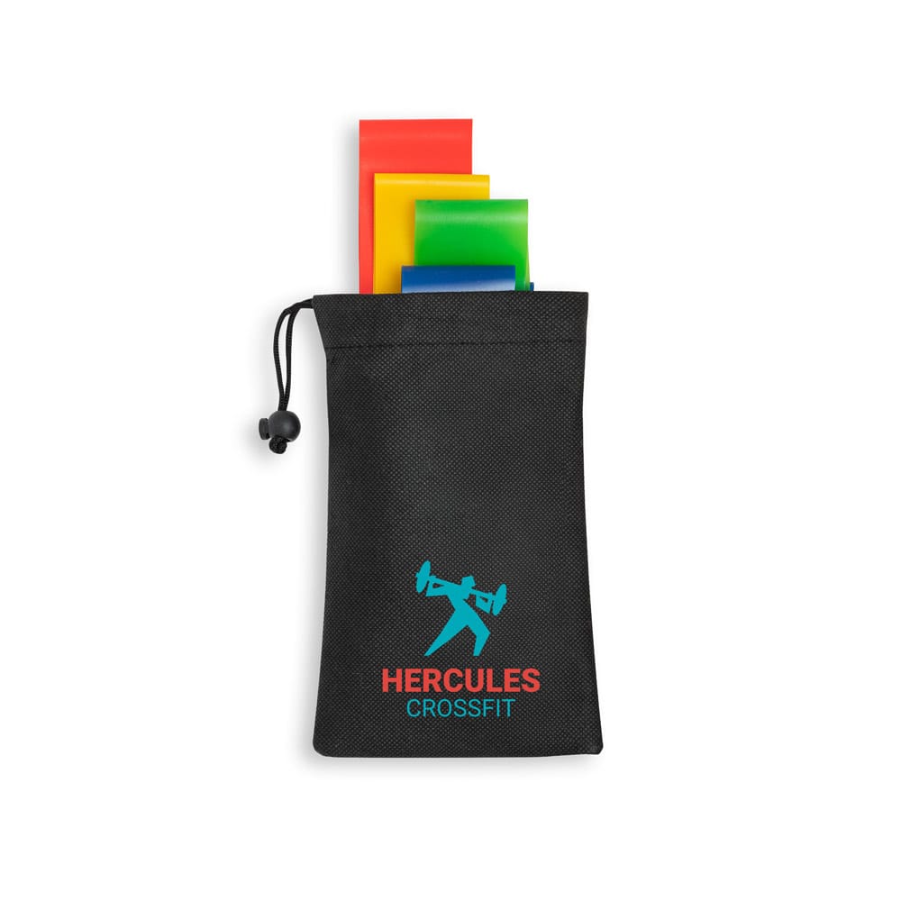 Conjunto de 4 bandas elásticas de ginástica em bolsa de non-woven preta. Cada banda tem um nível de resistência diferente: Vermelha – forte, Amarela – média, Azul – leve, Verde – muito leve