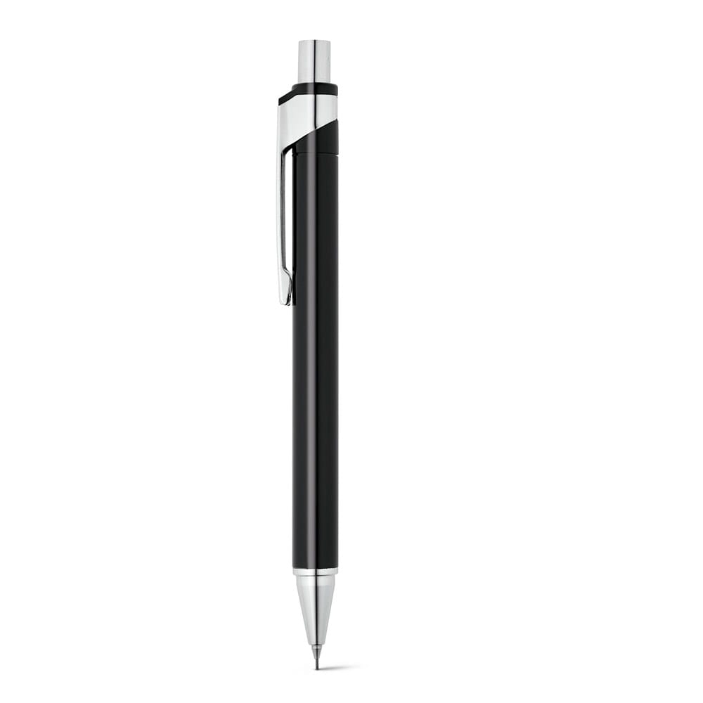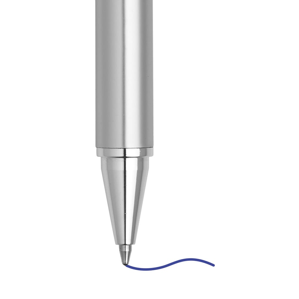 Kit de Caneta e lapiseira em alumínio. Escrita em azul até 1,5 km. Lapiseira com grafite 0.5 mm. Incluso estojo
