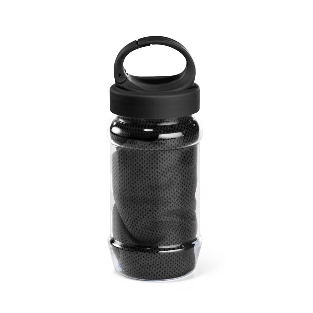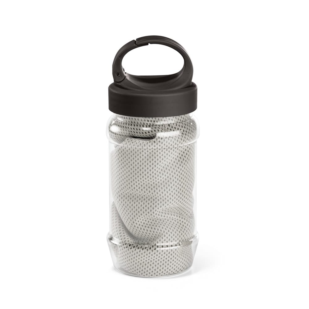 Kit composto por uma toalha e garrafa. A toalha para esporte, em poliamida e poliéster, quando molhada permanece fria durante horas. Se aquecer, basta balançar reativando sua frescura. Reutilizável e lavável à máquina. Garrafa em PP e PET com mosquetão incluso. Capacidade até 440ml. Caixa branca 94653 vendida opcionalmente. Certificação EU Food Grade