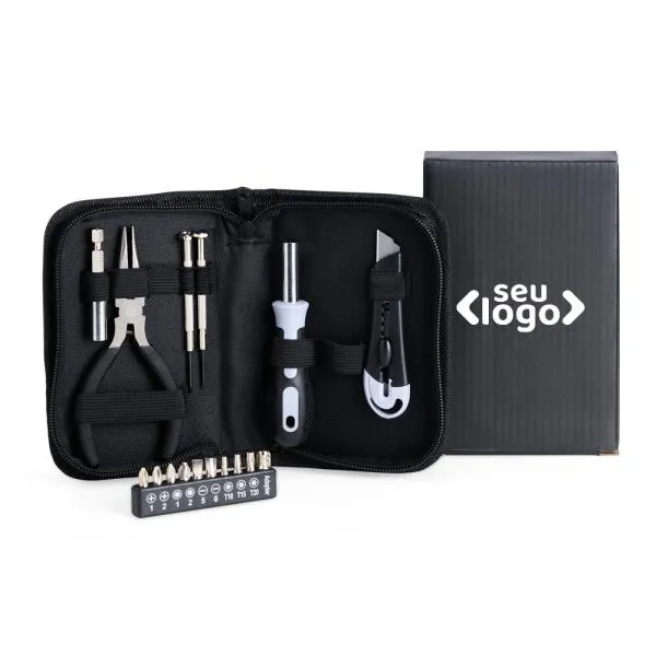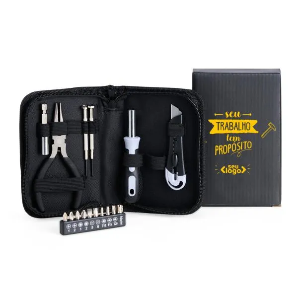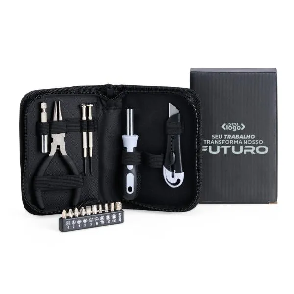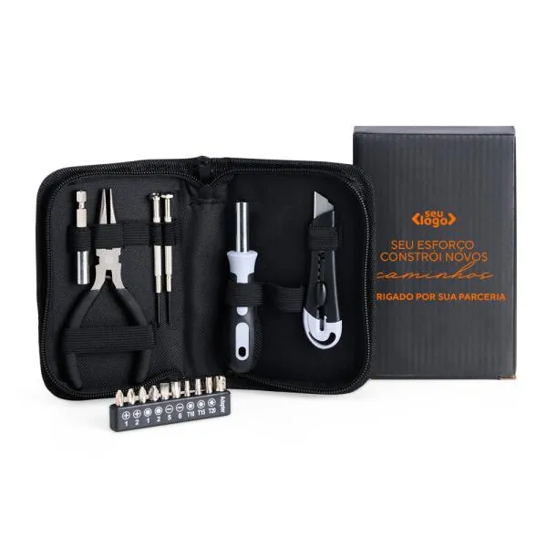 - Utilidade concreta: Um kit com 16 peças resolve situações cotidianas de manutenção, tornando o brinde algo que a pessoa realmente guarda e usa