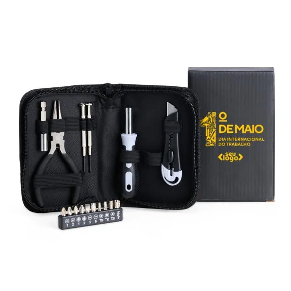 Um kit de ferramentas personalizado é um brinde corporativo com utilidade real no dia a dia, ideal para datas como o Dia do Trabalho e para empresas que querem reconhecer colaboradores com algo prático e duradouro. Com 16 peças organizadas em estojo de nylon personalizado, este conjunto atende a diferentes necessidades de manutenção e reparo. A personalização digital no estojo mantém a identidade da sua marca visível sempre que o kit for utilizado.