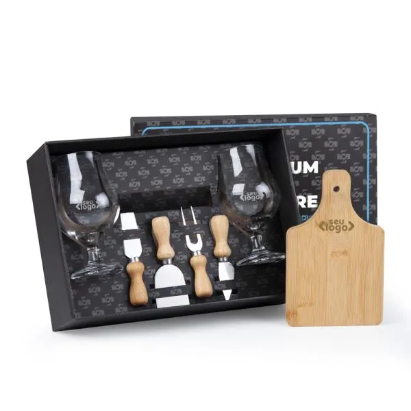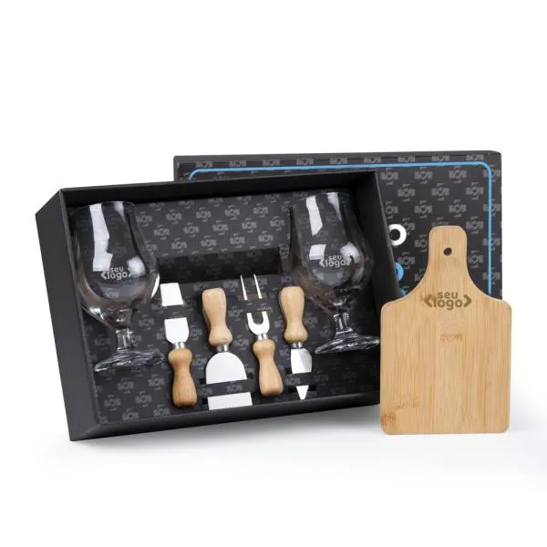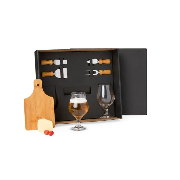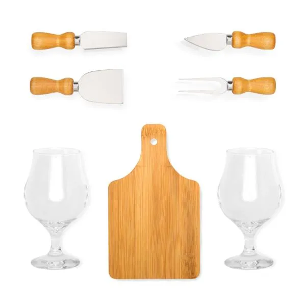 - Composição: 7 peças — tábua em bambu, duas facas, uma espátula e um garfo para queijo em madeira/inox, e 2 taças para cerveja em vidro