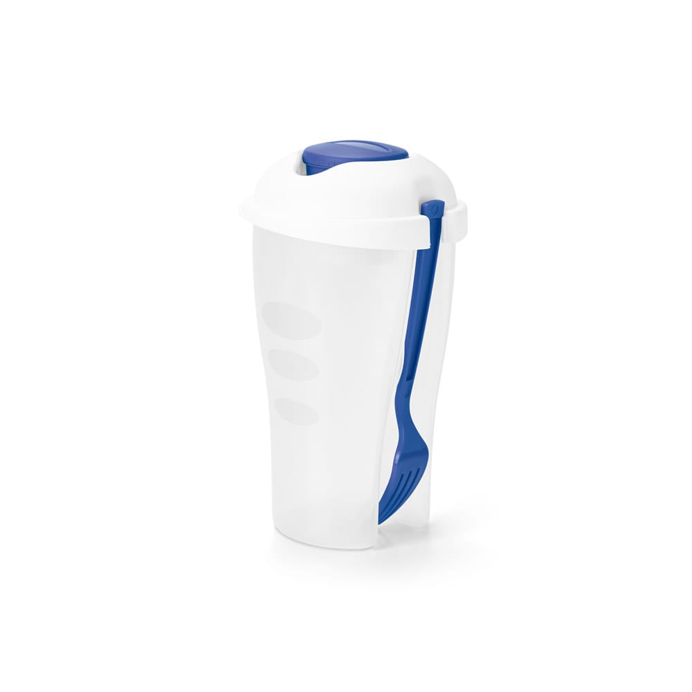 Copo para salada em PP com garfo e molheira. Capacidade até 850ml. Apto para micro-ondas, retirando a tampa. Caixa branca 94659 vendida opcionalmente. Certificação EU Food Grade