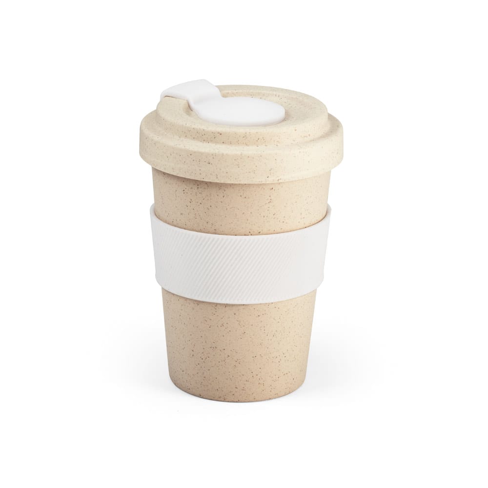 Copo de viagem em fibra de bambu (60%) e PP (40%) com tampa. A tampa em silicone no topo roda para tapar abertura e prevenir salpicos. Tira de silicone no corpo para facilitar o transporte. Capacidade até 500ml. Certificação EU Food Grade
