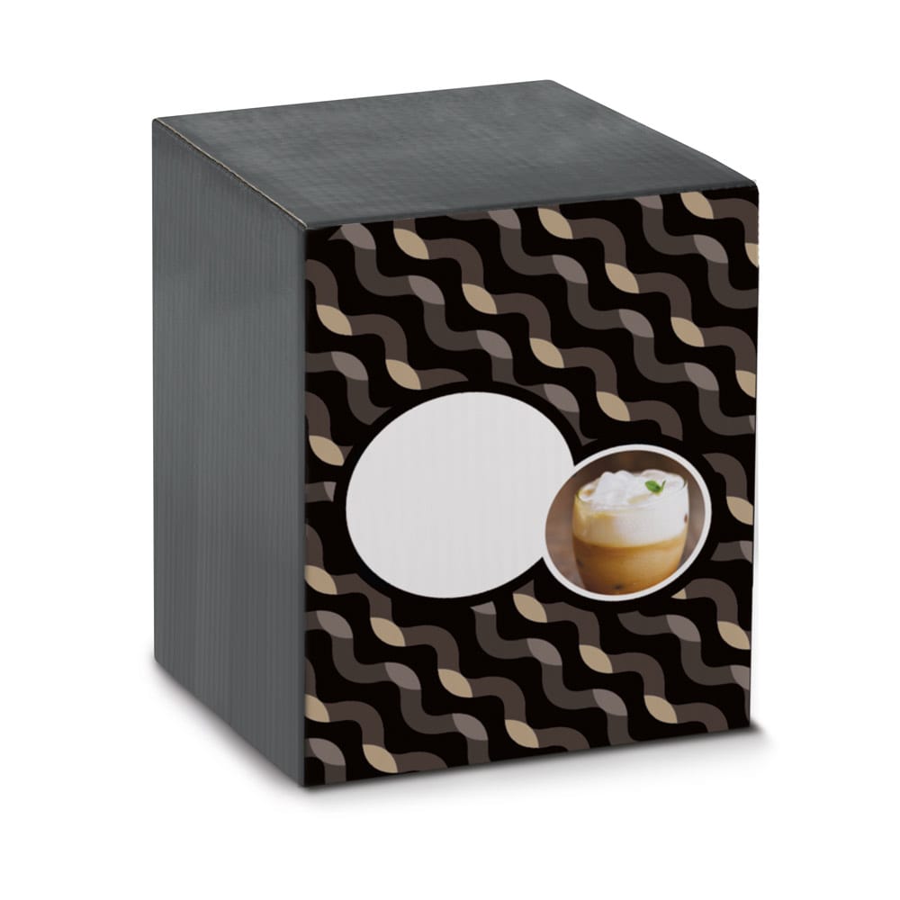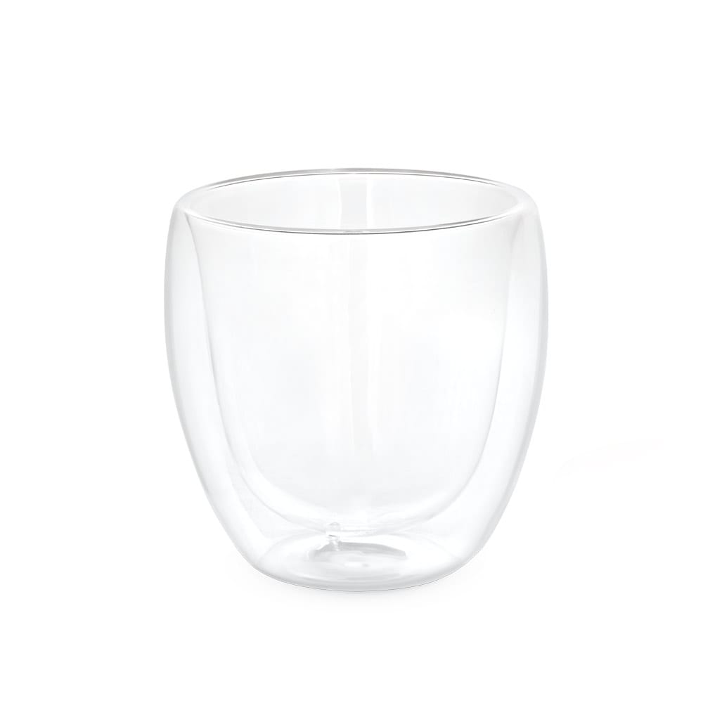 Copo em vidro borossilicato com parede dupla isolada a ar. Capacidade até 220ml. Fornecido em caixa presente personalizável. Certificação EU Food Grade