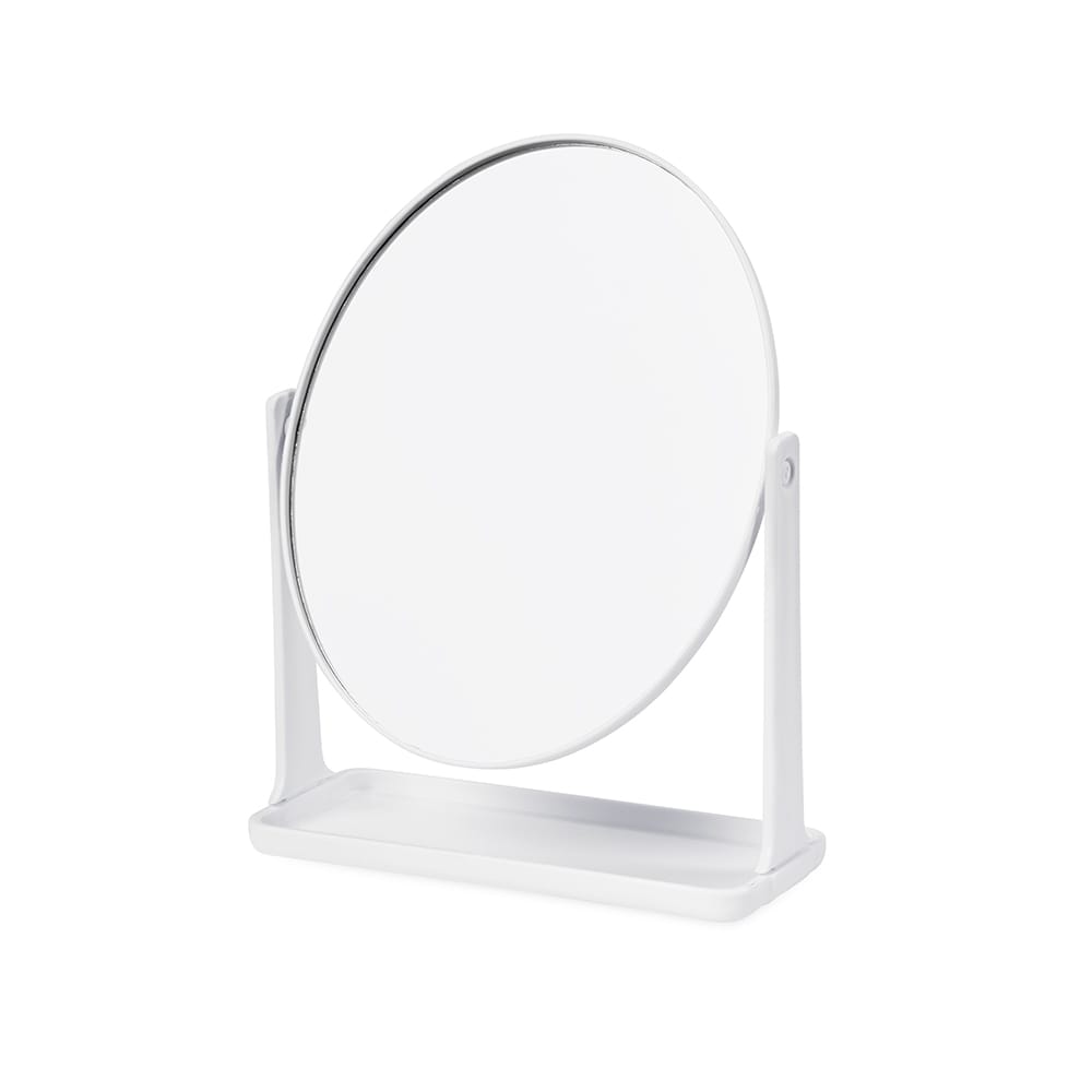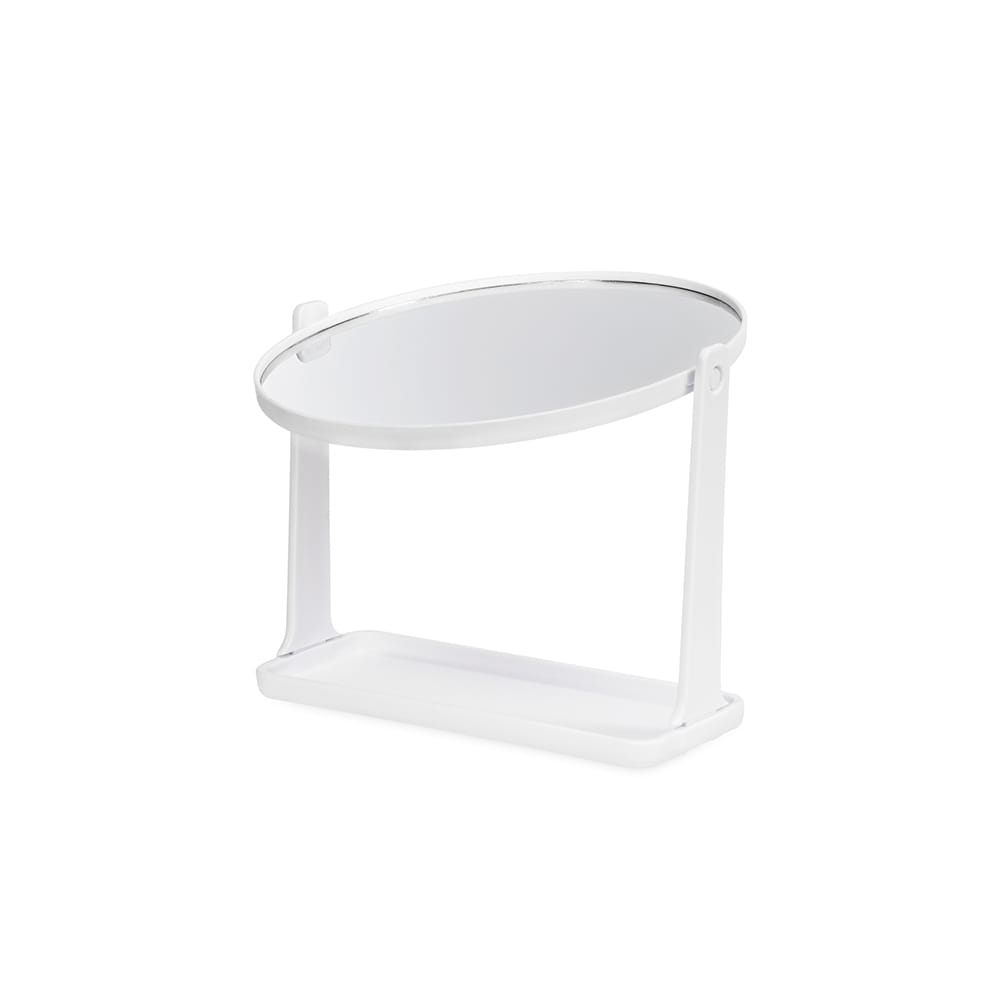 Espelho de mesa giratório sem aumento em formato oval, com estrutura em plástico e base com espaço para organizar pequenos objetos.