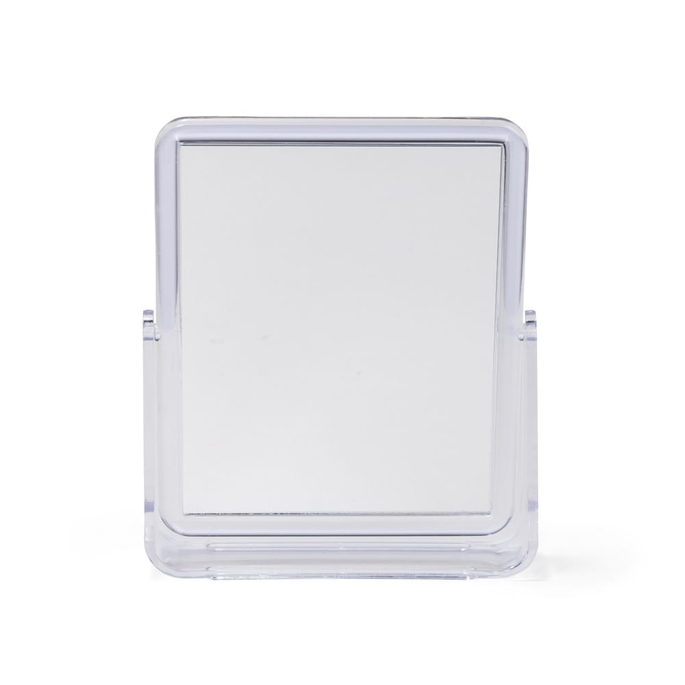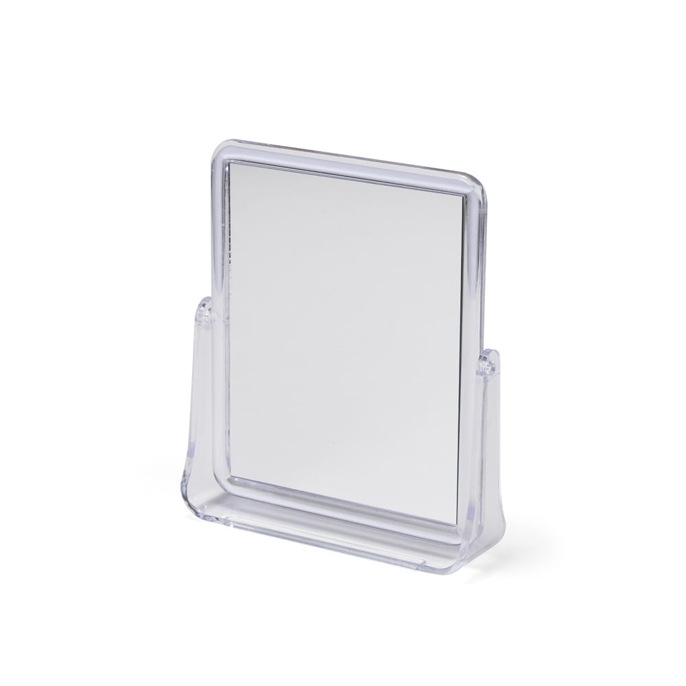 Espelho de mesa retangular giratório com face dupla sem aumento e estrutura em plástico polipropileno (PP) transparente.