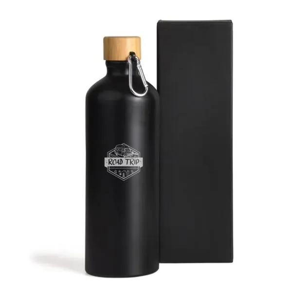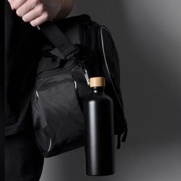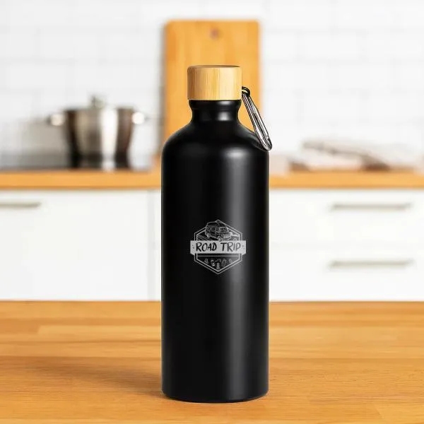 - Gravação a laser com precisão: A técnica laser remove a camada superficial do alumínio e revela o metal em contraste com o preto da garrafa, resultando em uma aplicação de logomarca visualmente marcante e resistente ao uso contínuo