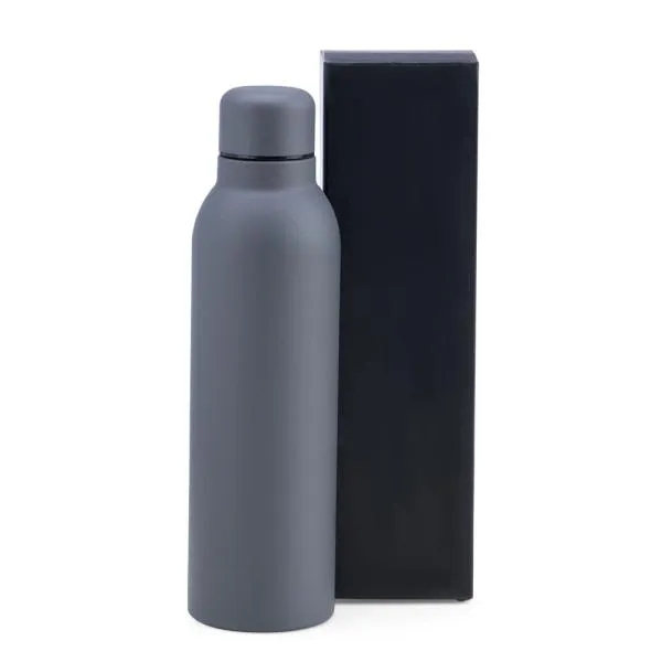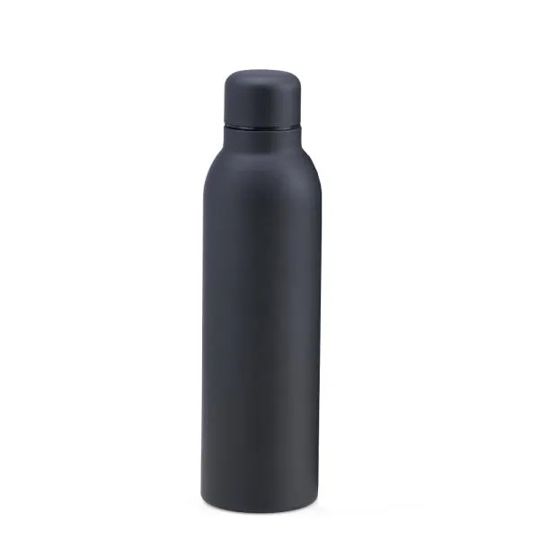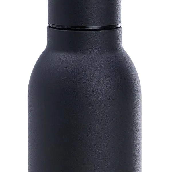 Garrafa preta em metal Inox, confeccionada com dupla parede em Inox, assim conseguindo manter e preservar os líquidos gelados e quentes por mais tempo.