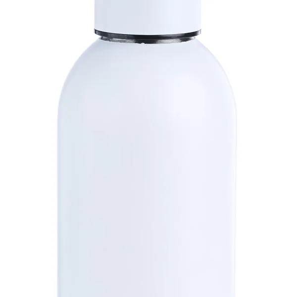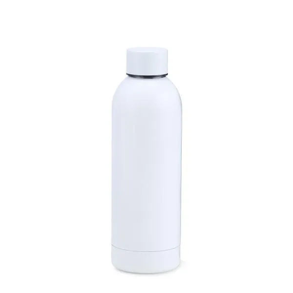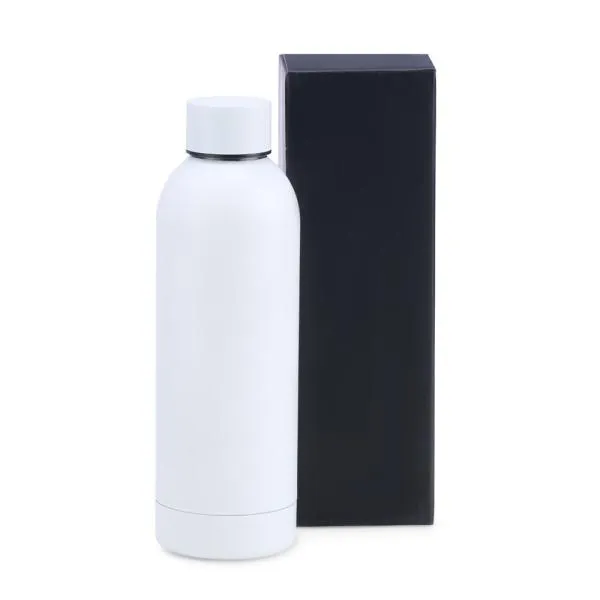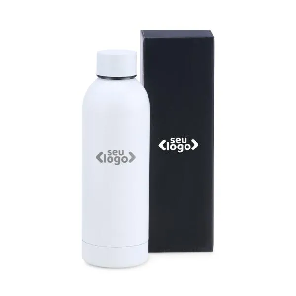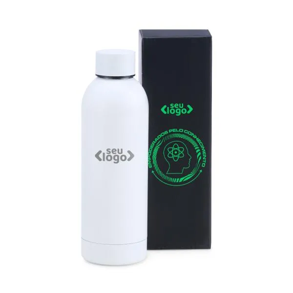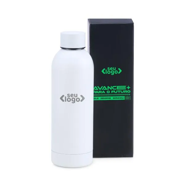Garrafa em Inox na cor branca, confeccionada com uma segunda parede de Inox para alta preservação de temperatura tanto de líquidos gelados, quanto de líquidos quentes.