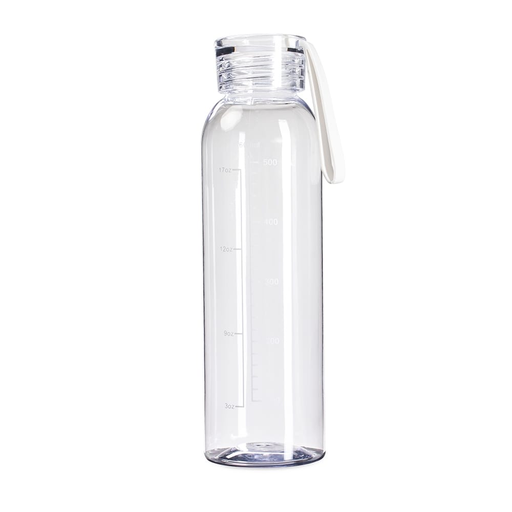 Garrafa feita em plástico livre de BPA com capacidade máxima de 640ml e marcação de volume impressa de até 600ml. Conta com tampa plástica rosqueável com alça de silicone fixa.