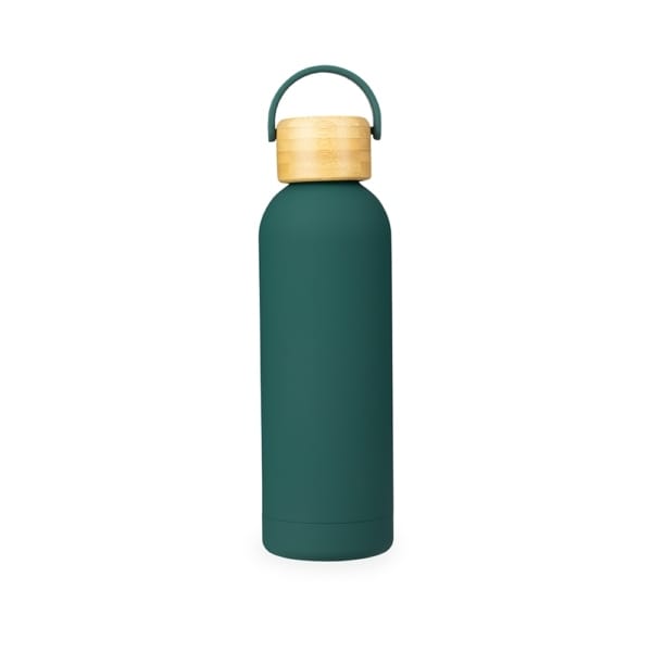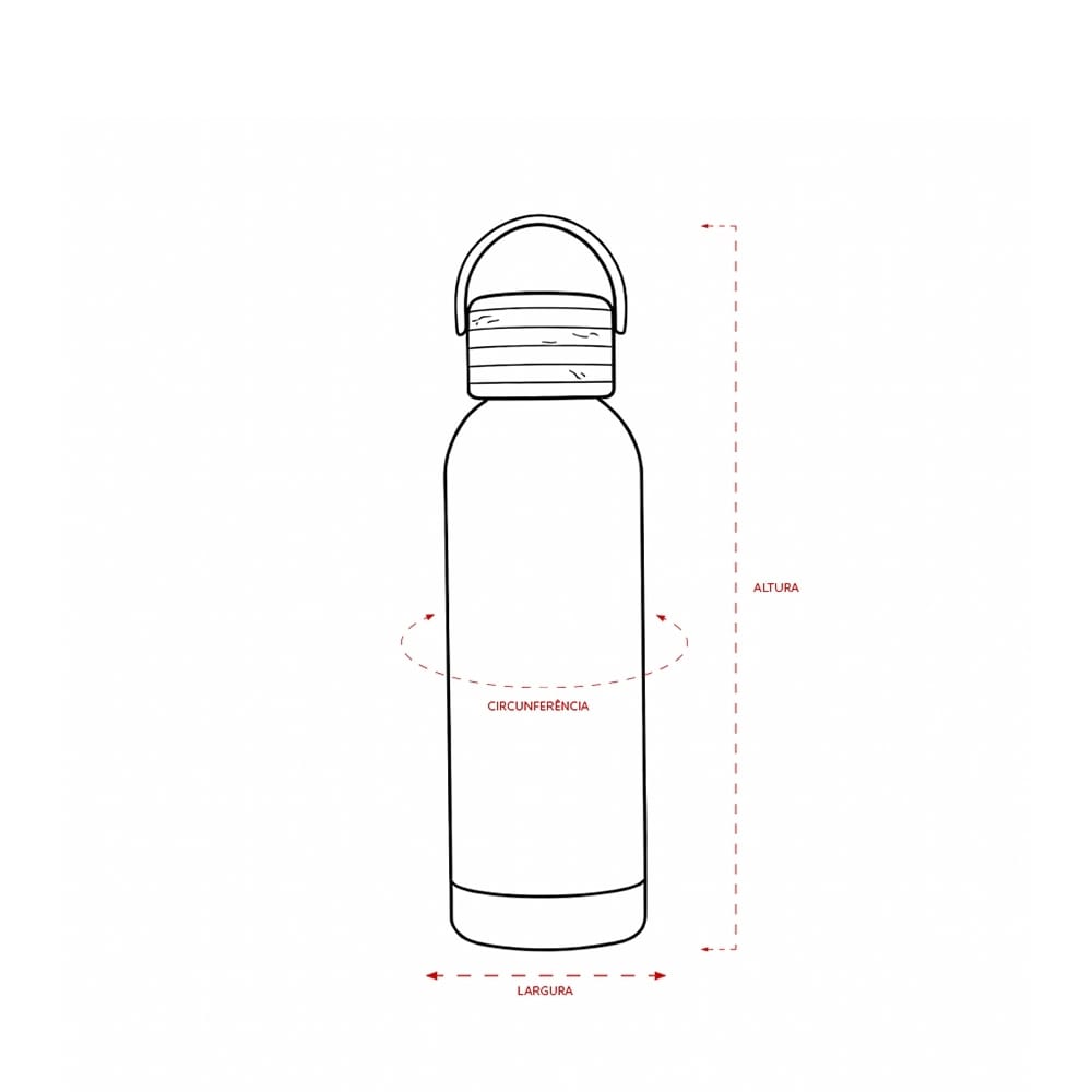 Garrafa térmica em inox com pintura emborrachada e capacidade para até 500ml. Possui estrutura de parede dupla e vedação a vácuo que permite conservar a temperatura de bebidas por mais tempo, além de tampa rosqueável em bambu com alça plástica para transporte.