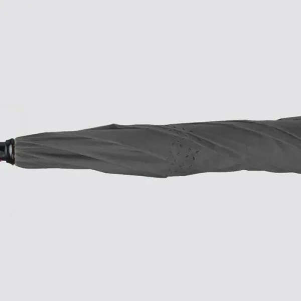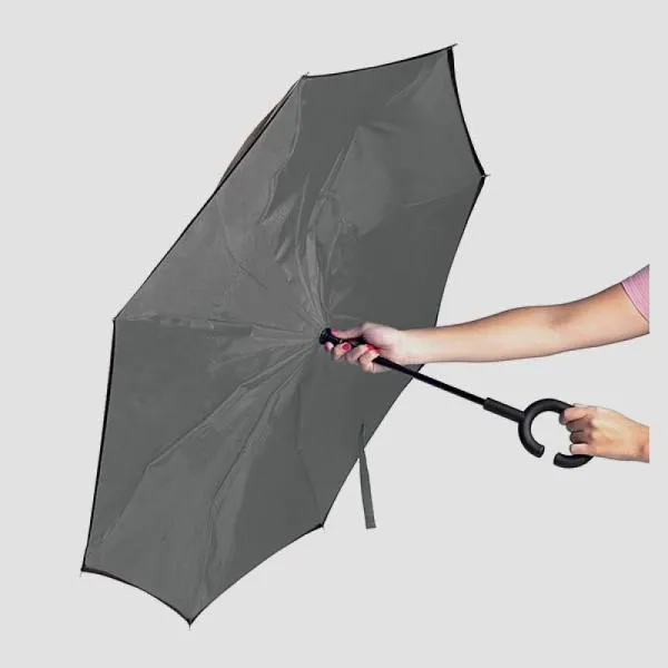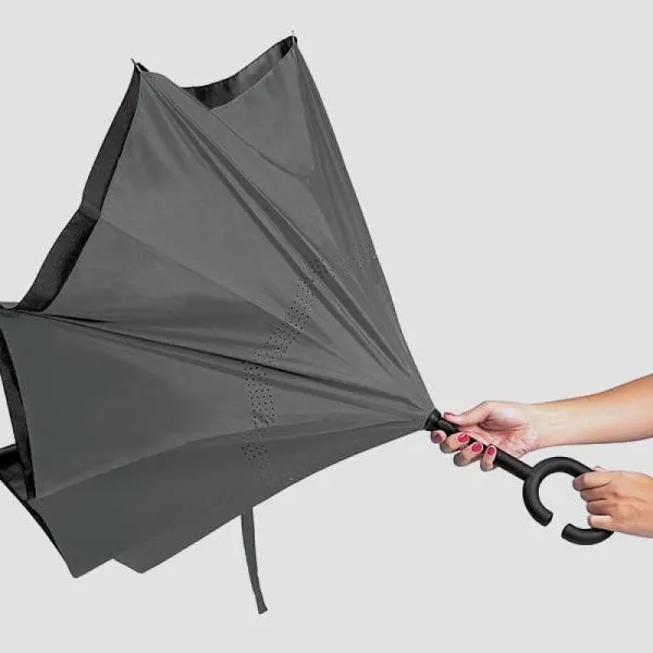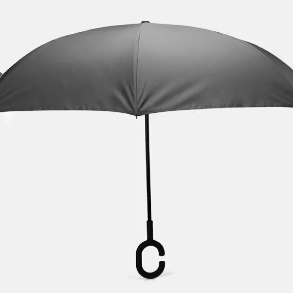 Guarda-chuva cinza em Seda Sintética invertido cinza/preto com cabo em Fibra de Vidro, empunhadura emborrachada, hastes em plástico resistente e fechamento em velcro.