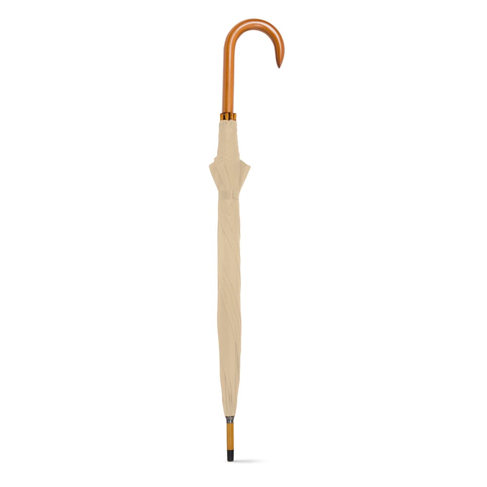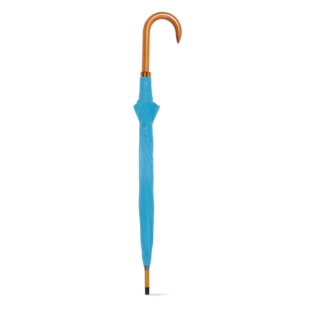 Guarda-chuva em poliéster 190T, com haste em metal e pega em madeira. O guarda-chuva tem abertura automática