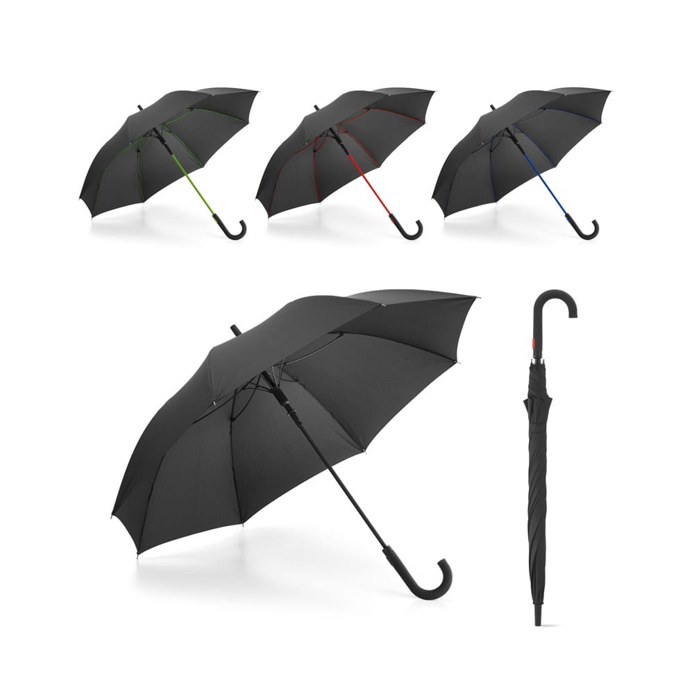 Guarda-chuva em poliéster pongee 190T, com varetas em fibra de vidro coloridas e pega revestida a borracha. Abertura automática