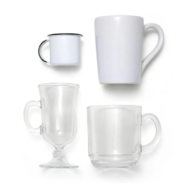 Conta com caneca em vidro com capacidade de 300ml, caneca de vidro p/ café com capacidade de 130ml, caneca em cerâmica branca com capacidade de 230ml e caneca em alumínio branca.