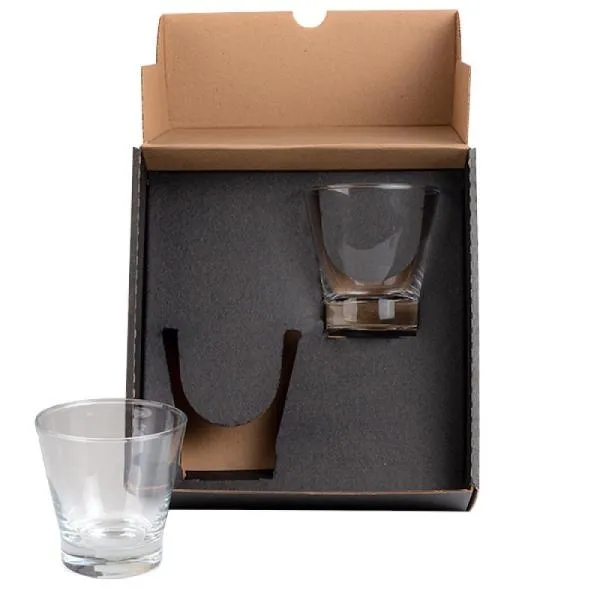 - Dupla personalização: A gravação a laser nos copos de vidro e a impressão na tampa da caixa garantem que sua marca aparece em dois pontos de contato diferentes, desde o momento em que o brinde é recebido