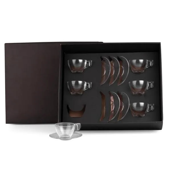 - Composição do kit: 6 xícaras com 6 pires em vidro