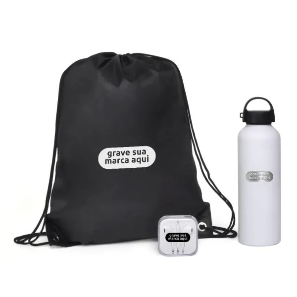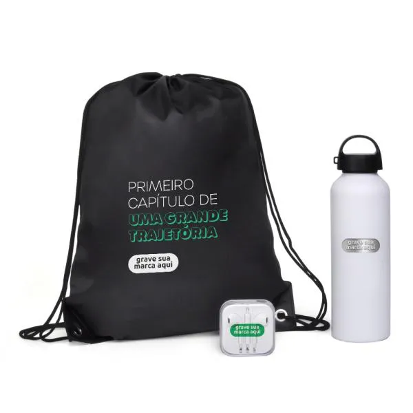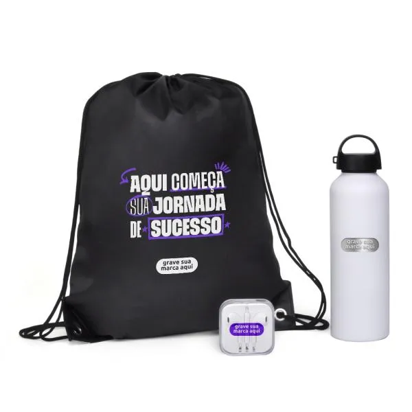 - Três itens, uma só experiência: Garrafa, mochila sacola e fone de ouvido formam um conjunto coerente, elevando a percepção de valor da sua marca na entrega
