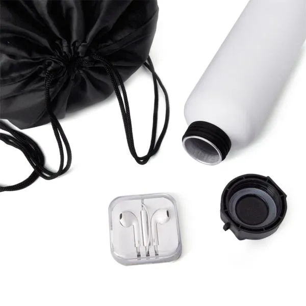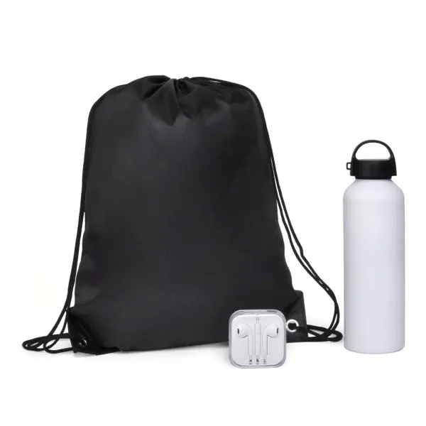 Garrafa branca em alumínio com capacidade de 600ml; mochila sacola preta em Nylon 190D com alças ajustáveis e fone de ouvido branco com microfone, controle de volume e estojo plástico.