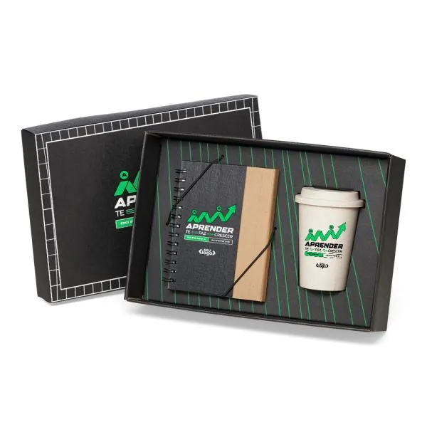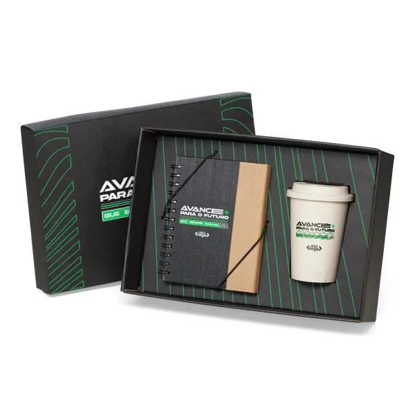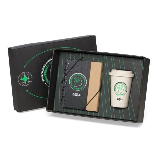 - Personalização: Gravação em Silkscreen no caderno e no copo