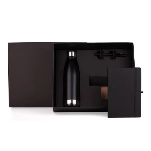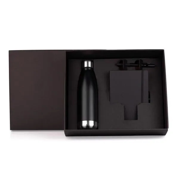 Kit composto por garrafa em aço Inox preta com tampa rosqueável; caderno para anotações preto com capa dura e caneta em ABS preta.