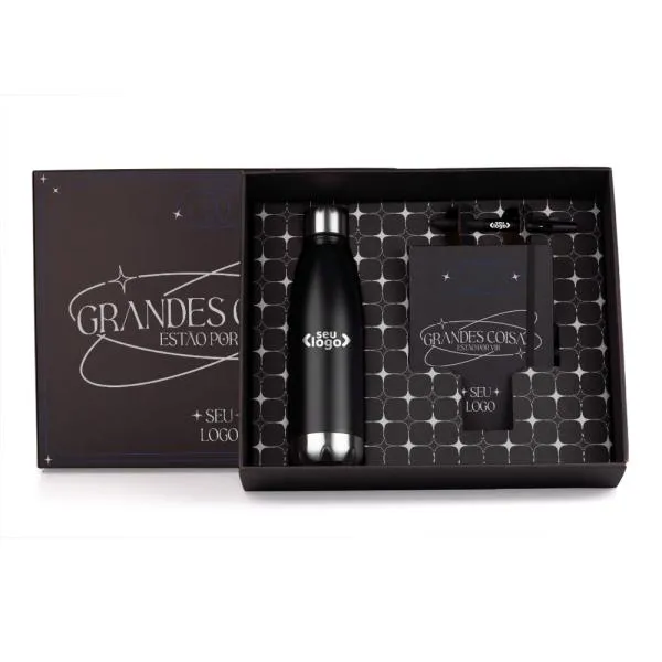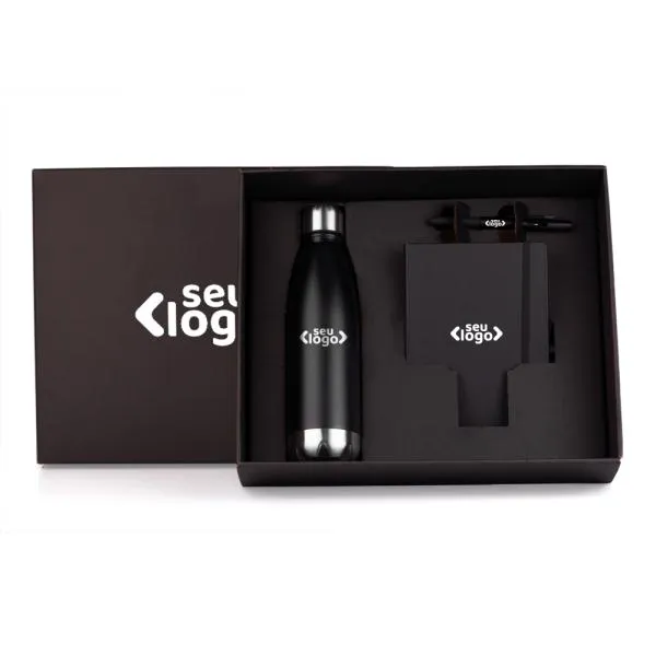 Kit composto por garrafa em aço Inox preta com tampa rosqueável; caderno para anotações preto com capa dura e caneta em ABS preta.