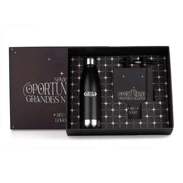 - Embalagem que comunica cuidado: A caixa preta entregue junto ao kit já transmite atenção ao detalhe, sem necessidade de embalagem adicional